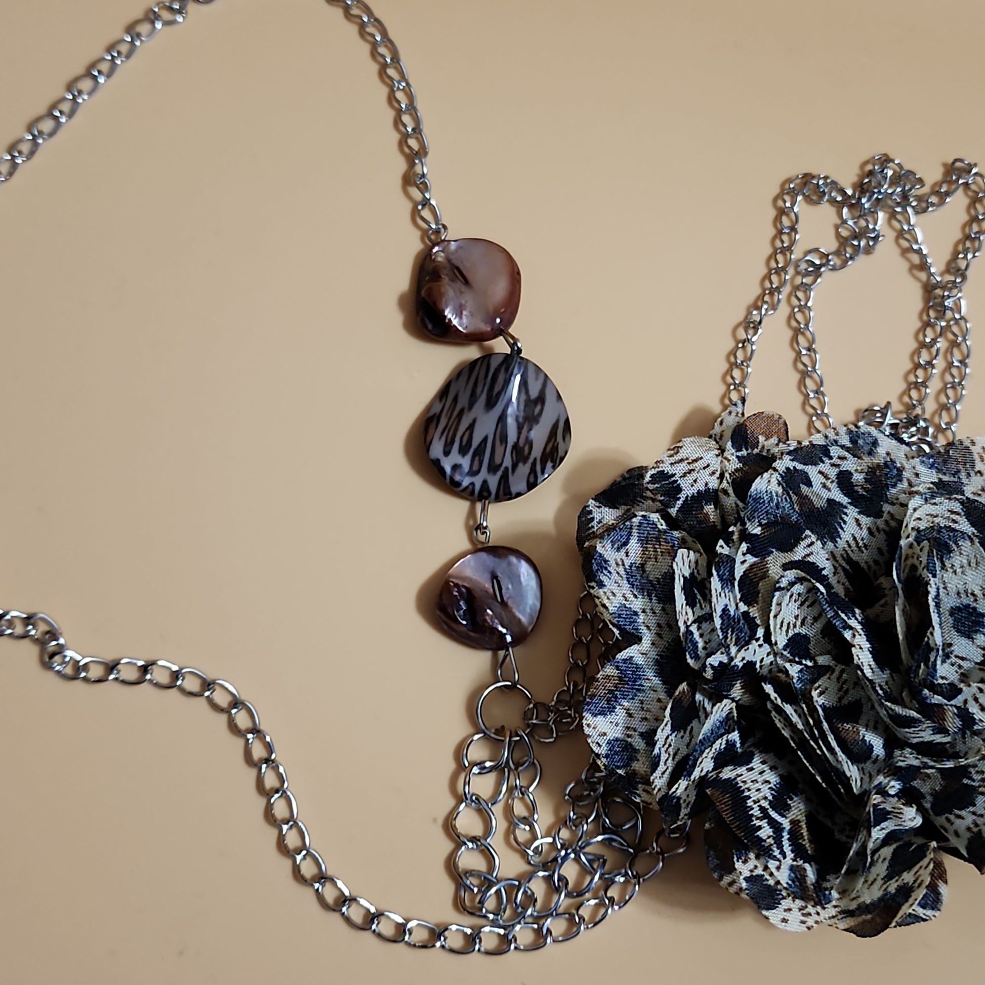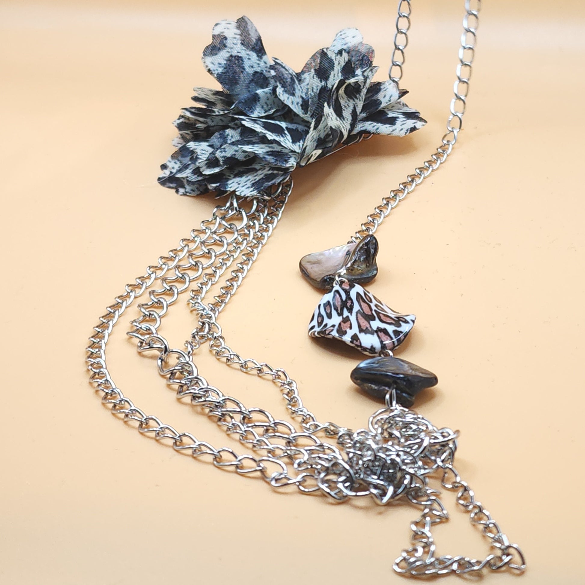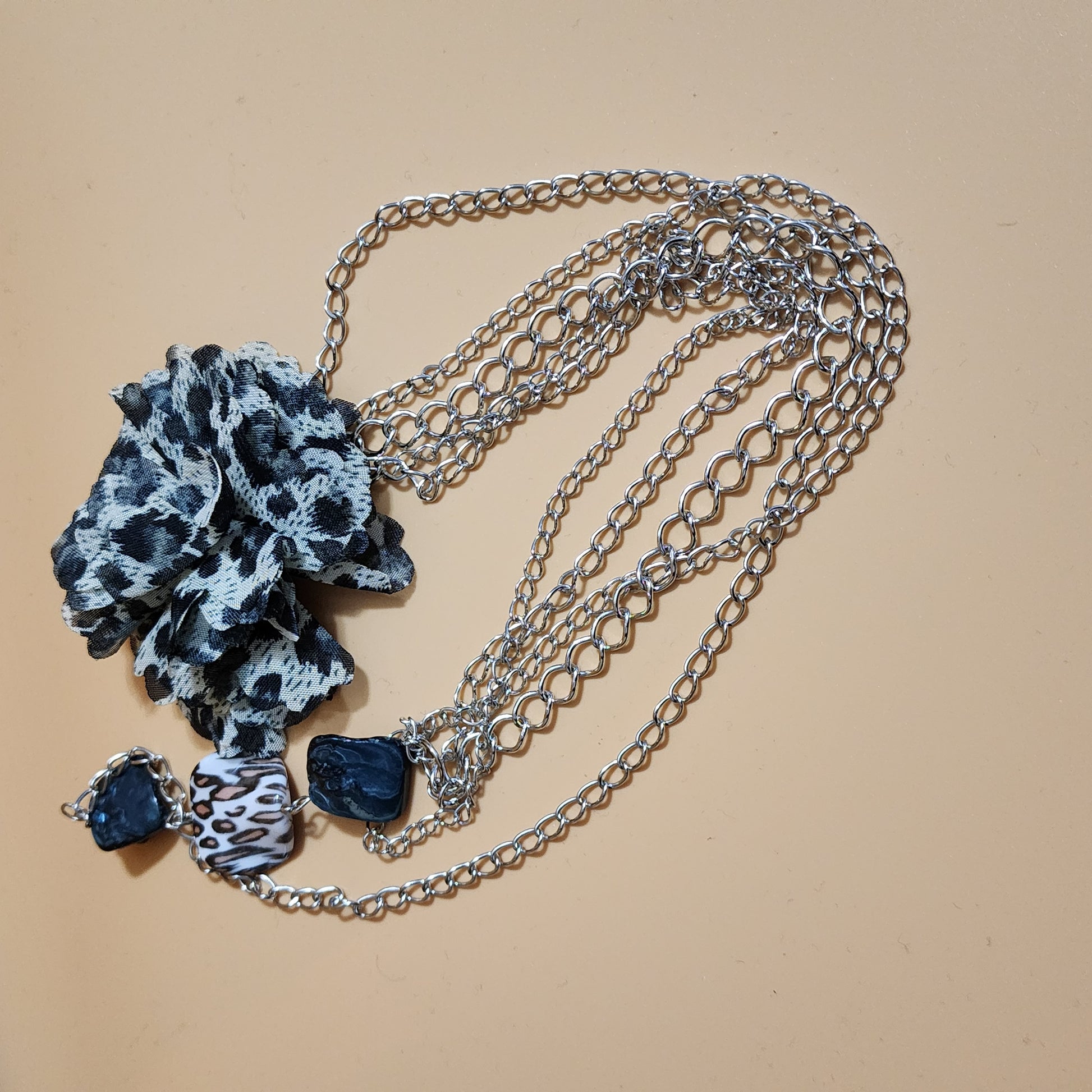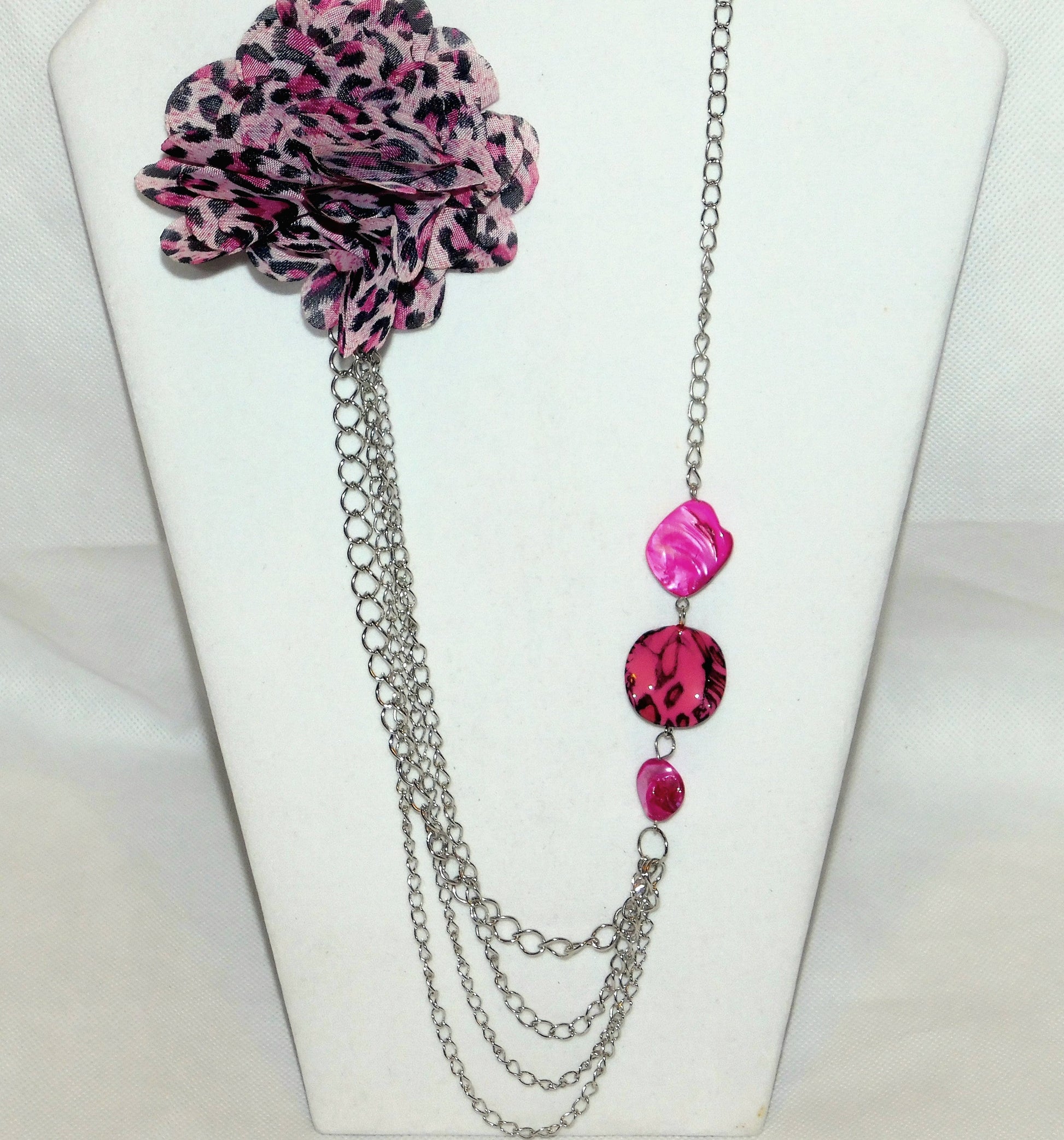 fashion jewelry necklace pull over necklace. about 32 in. pinned animal print fabric flower pendant and chain with faux stones accents