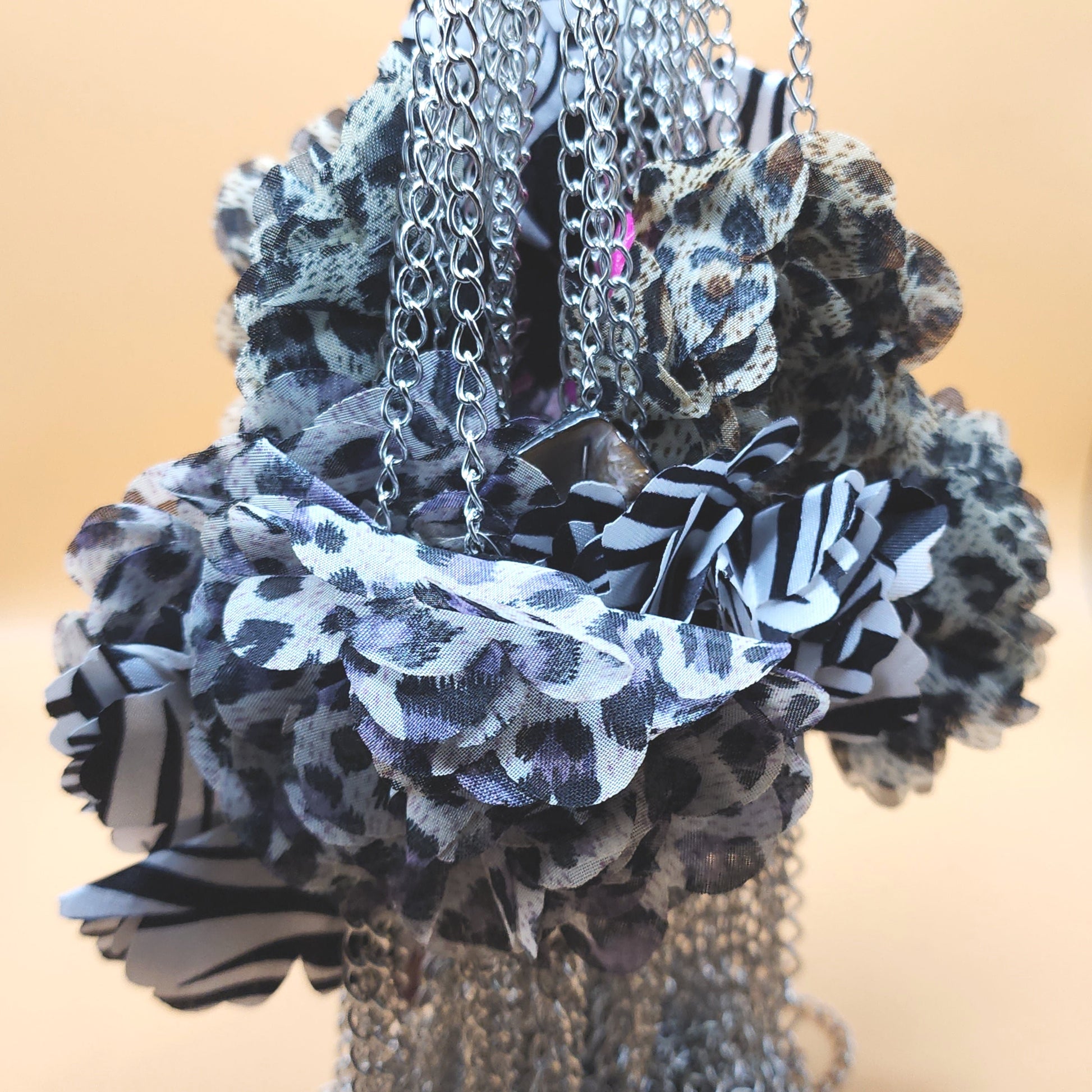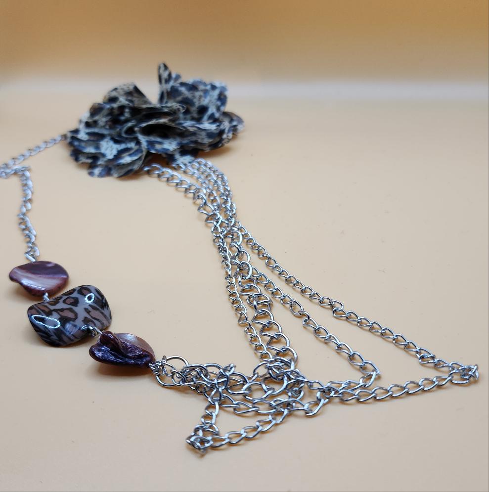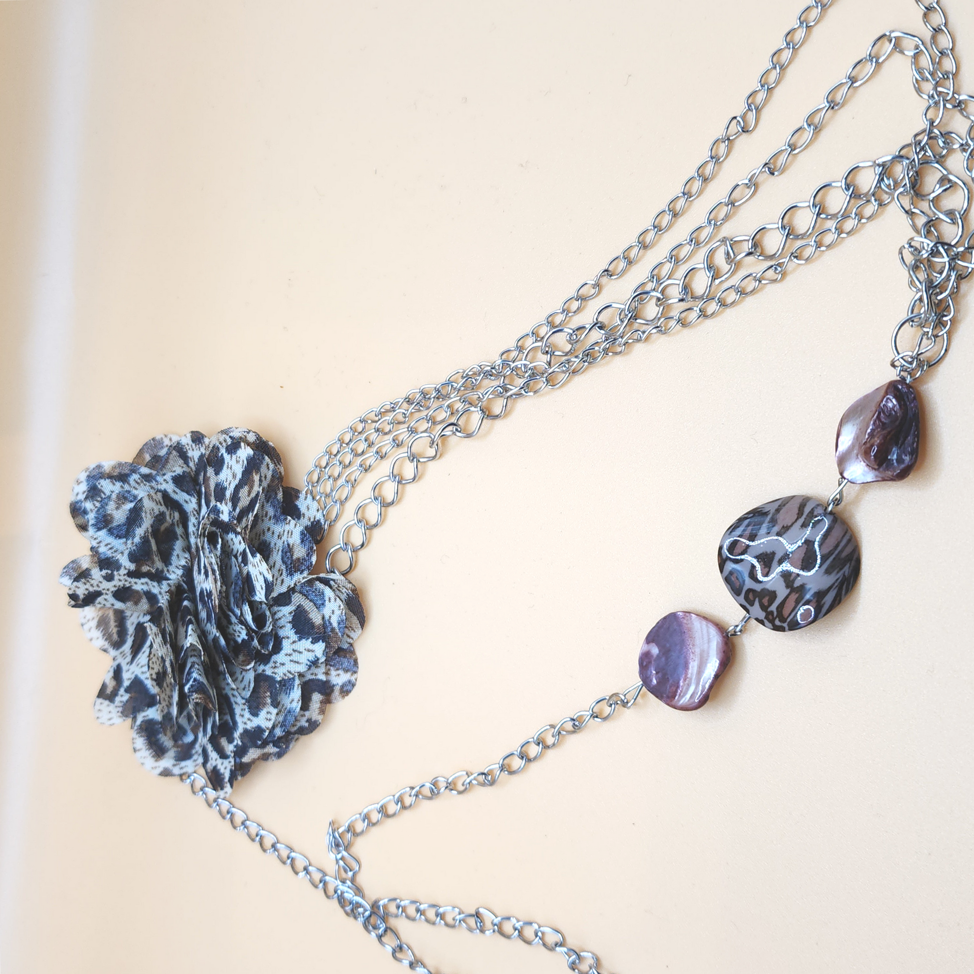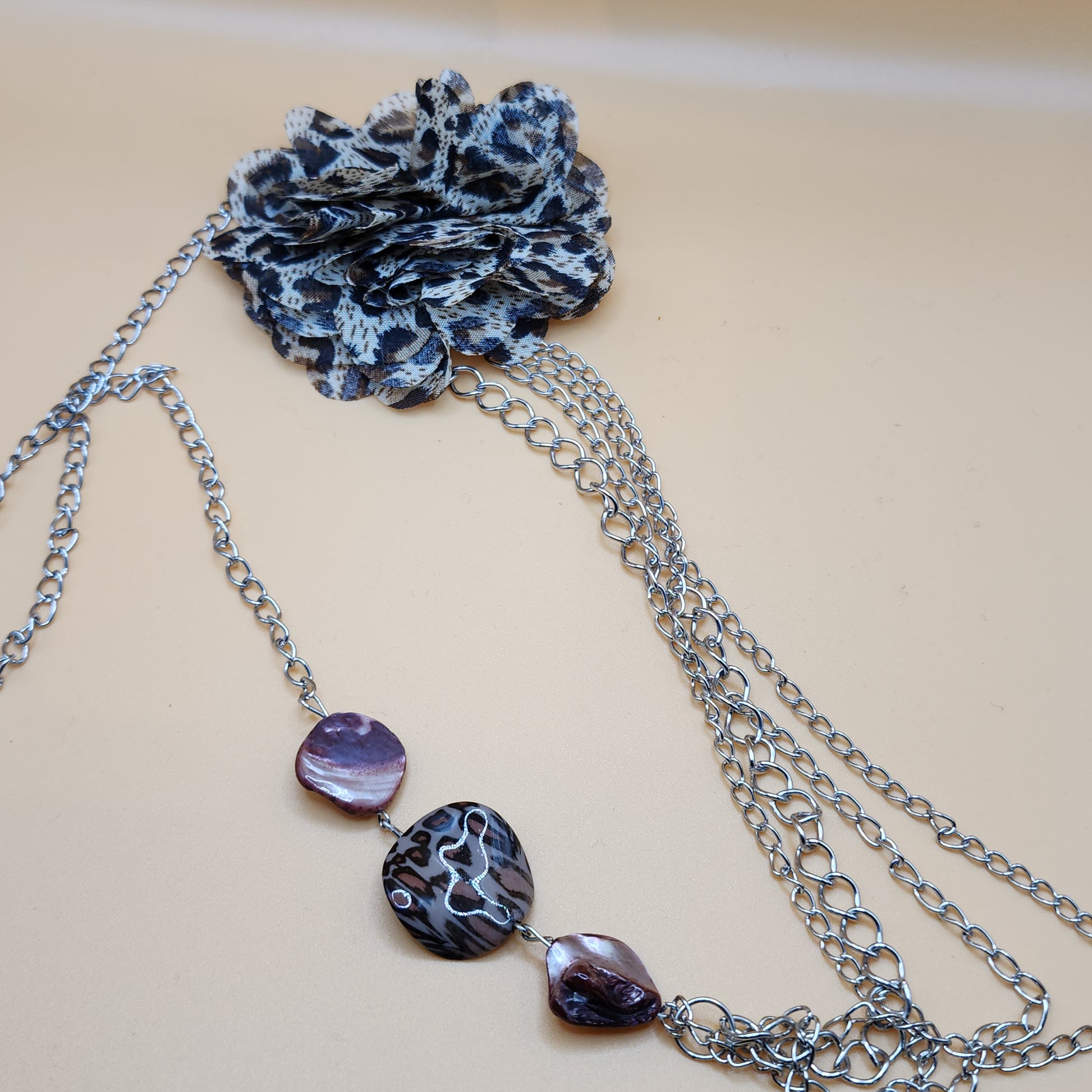 fashion jewelry necklace pull over necklace. about 32 in. pinned animal print fabric flower pendant and chain with faux stones accents