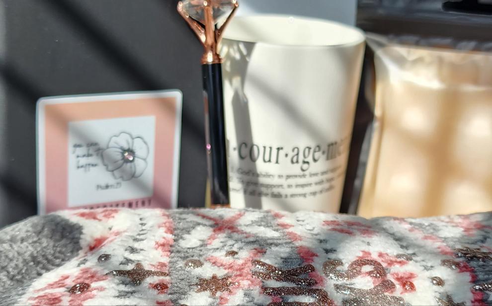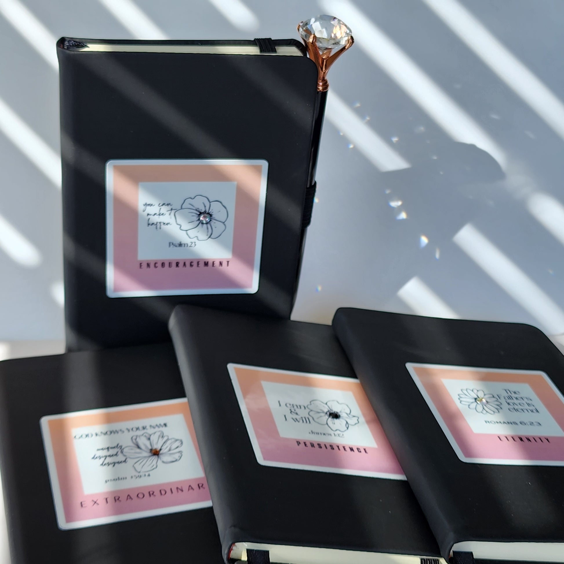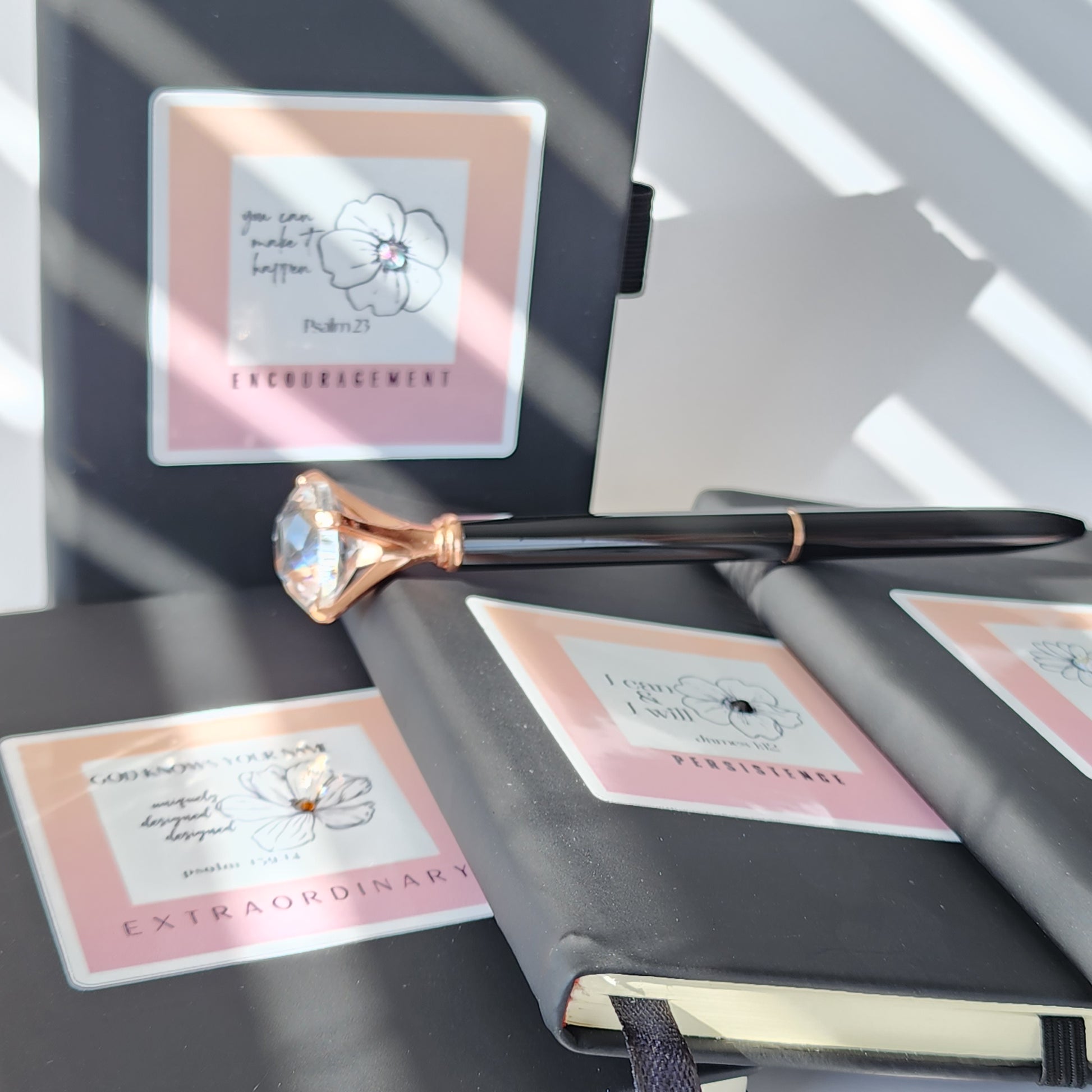 This 5 Pc. set is especially curated for the Scripture reading coffee or tea lover humorous note-taking love to write down thoughts type of person. Gift Set Includes: notebook/ journal with scripture inspiring cover design and hand set bling.includes Diamond designed pen(black ink) comfy cozy pair of socks(socks will be chosen randomly.Oh yeah & some extra goodies.