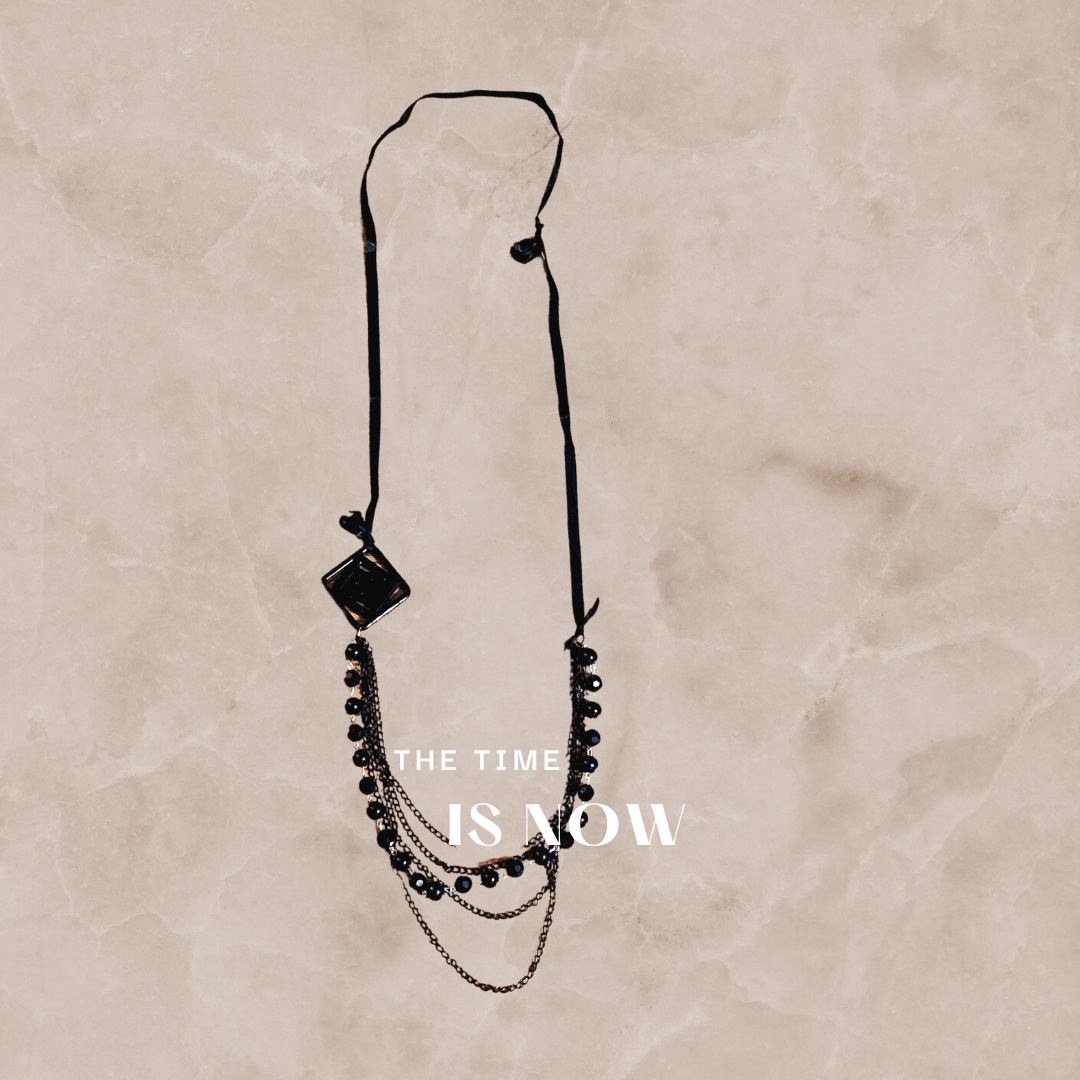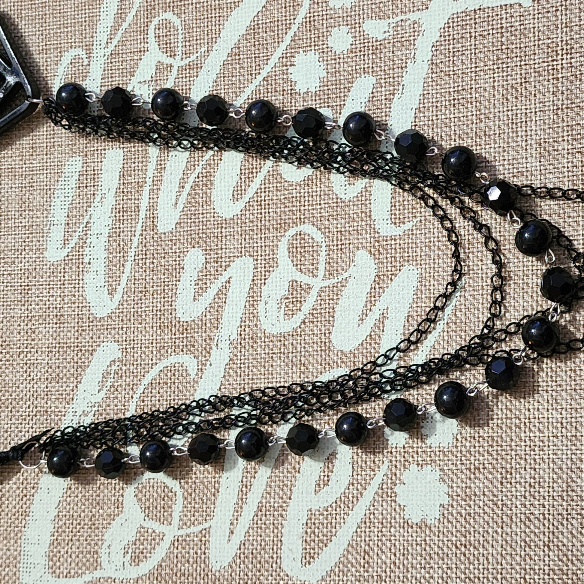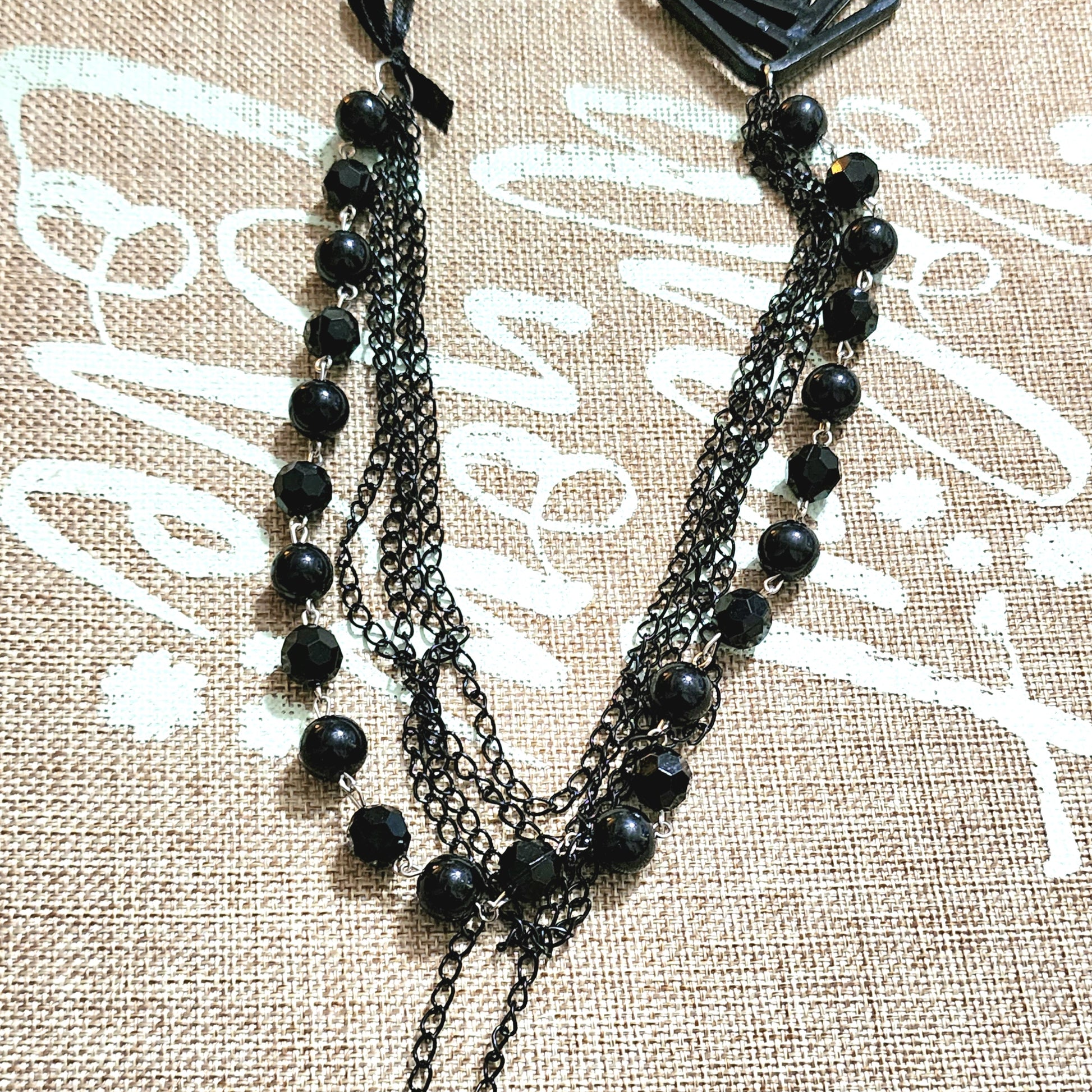 Black half ribbon black pendant quadruple Chain and beaded necklace adjustable