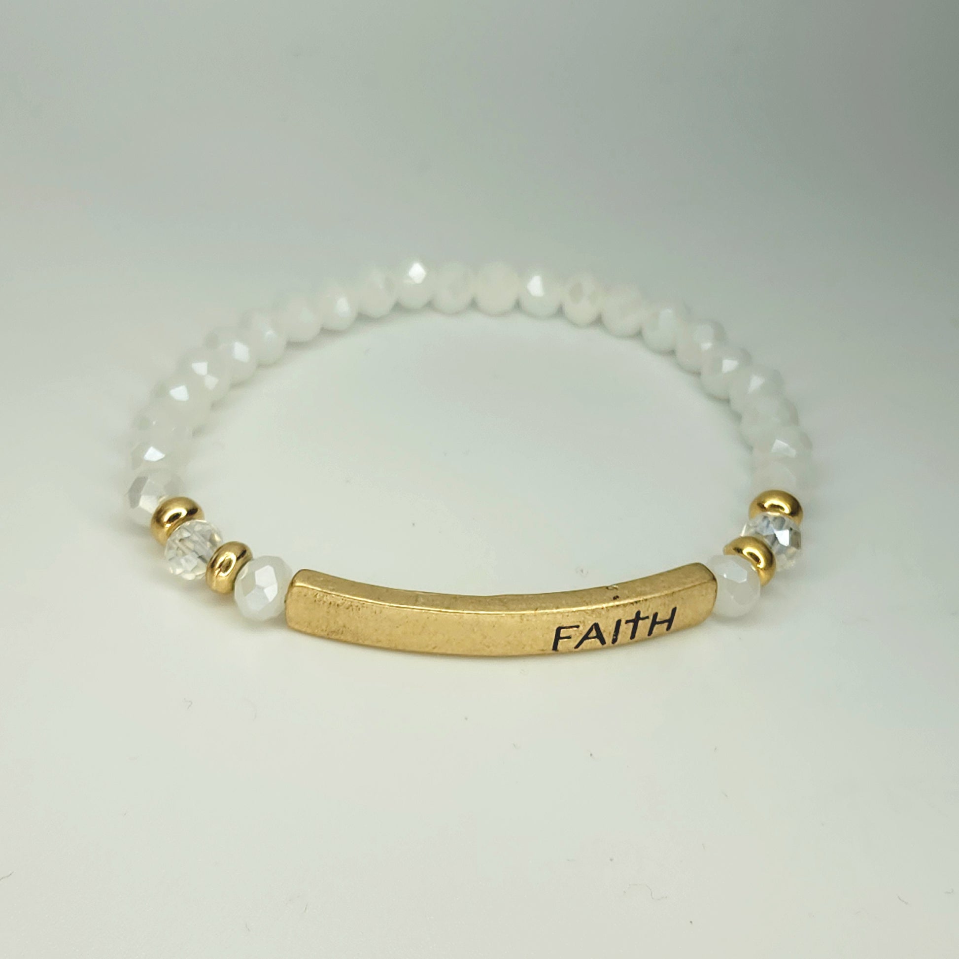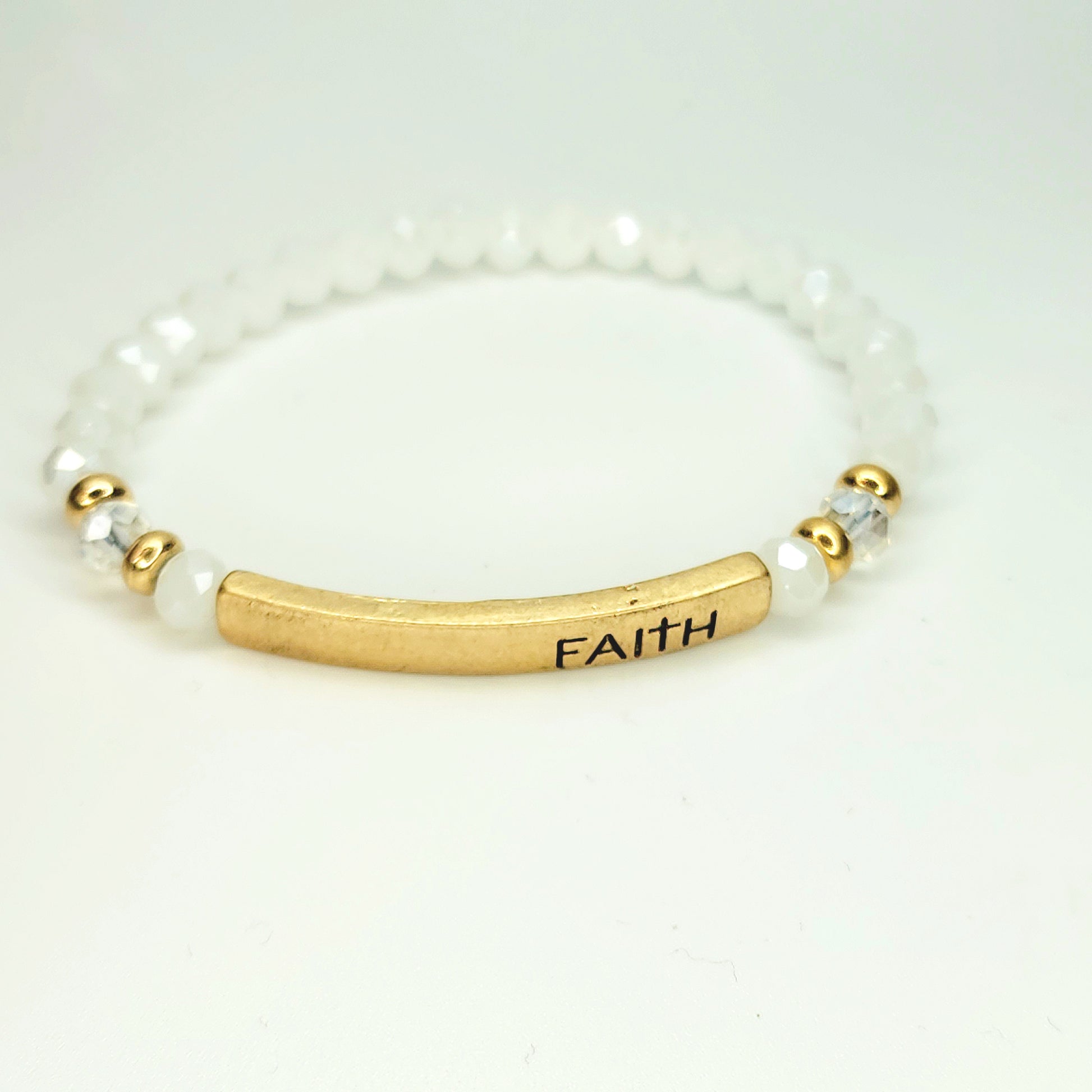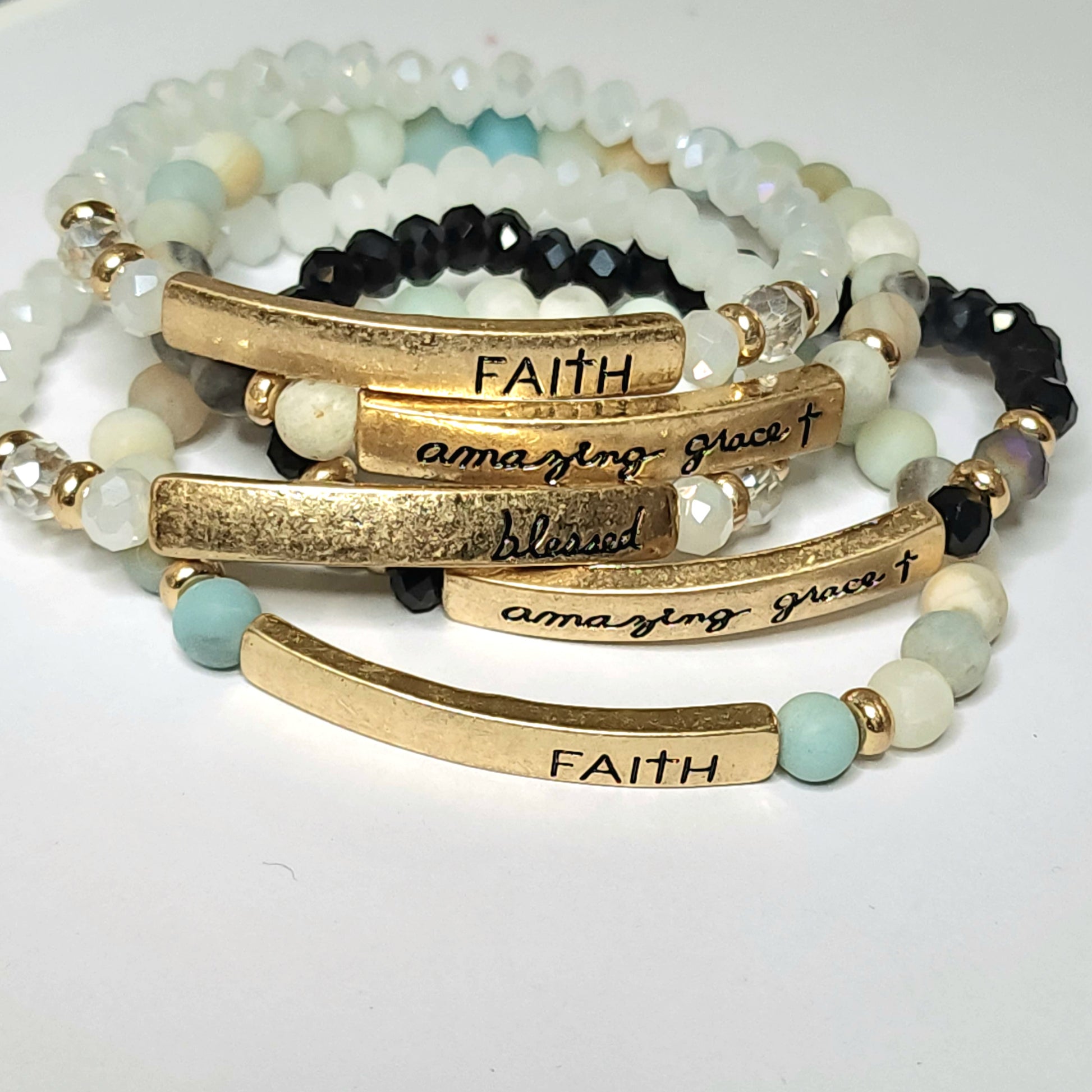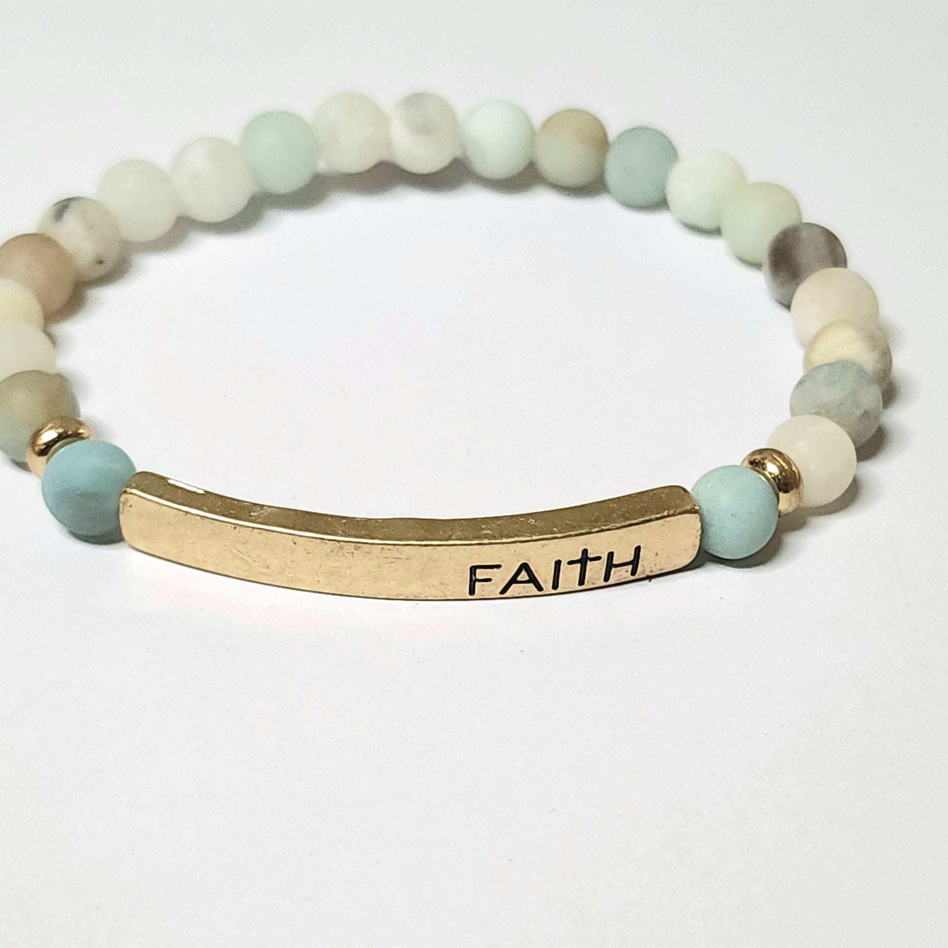 Wear your faith on your sleeve (LOL) or better yet your wrist. You will enjoy this beautiful yet simple bracelet as a symbol and reminder of your faith. This faith inspired gold tone message bar stretch bracelet surrounded by semi precious stone beads- will encourage a daily reminder of what you believe in and what was freely given to you.