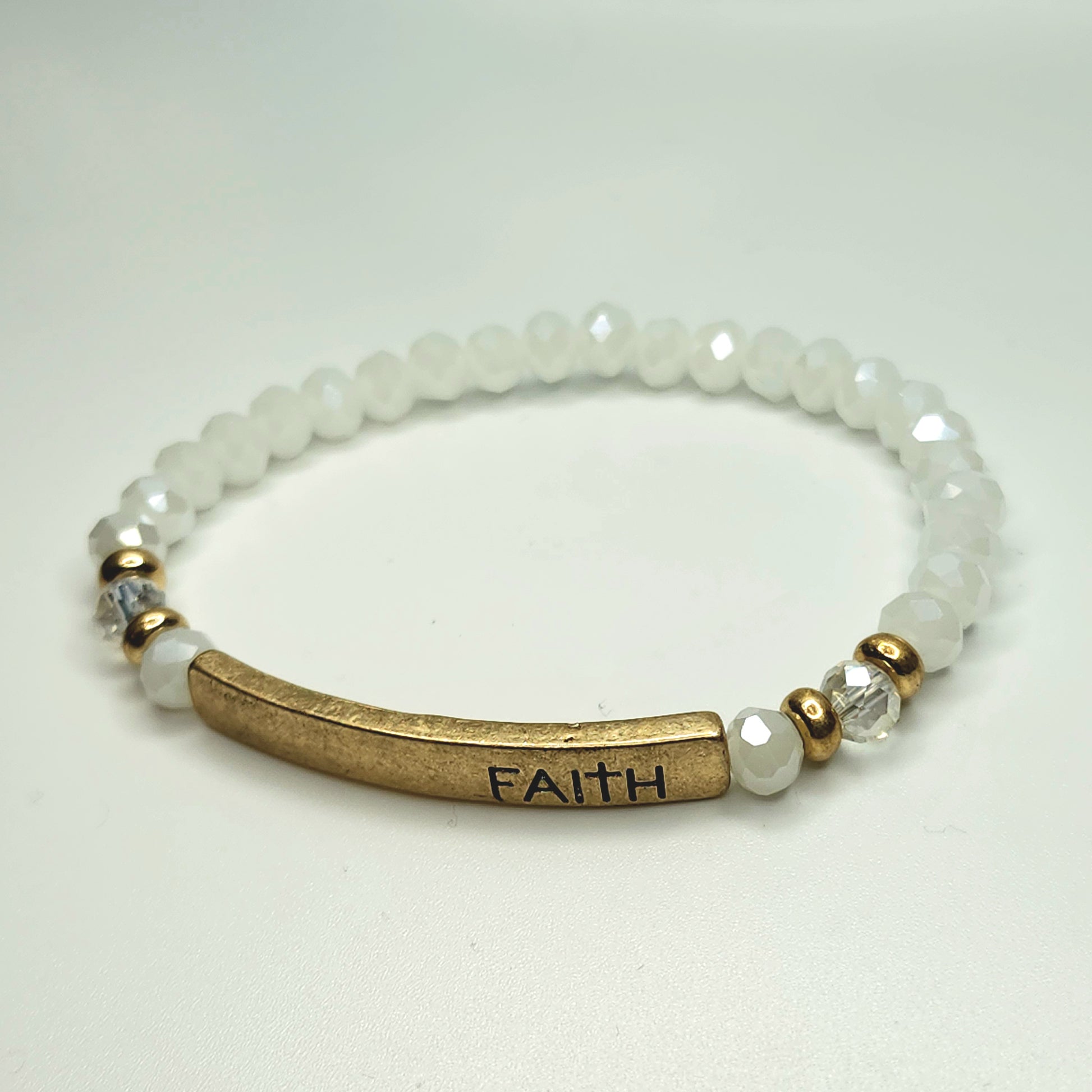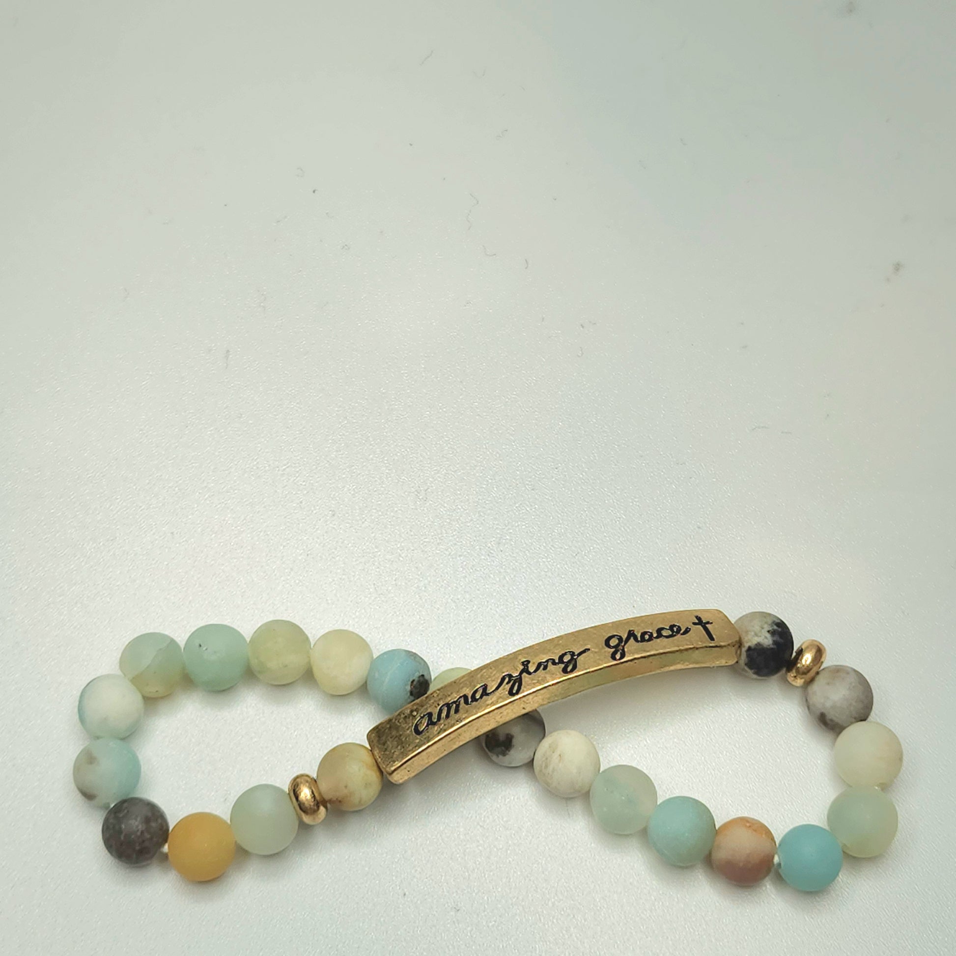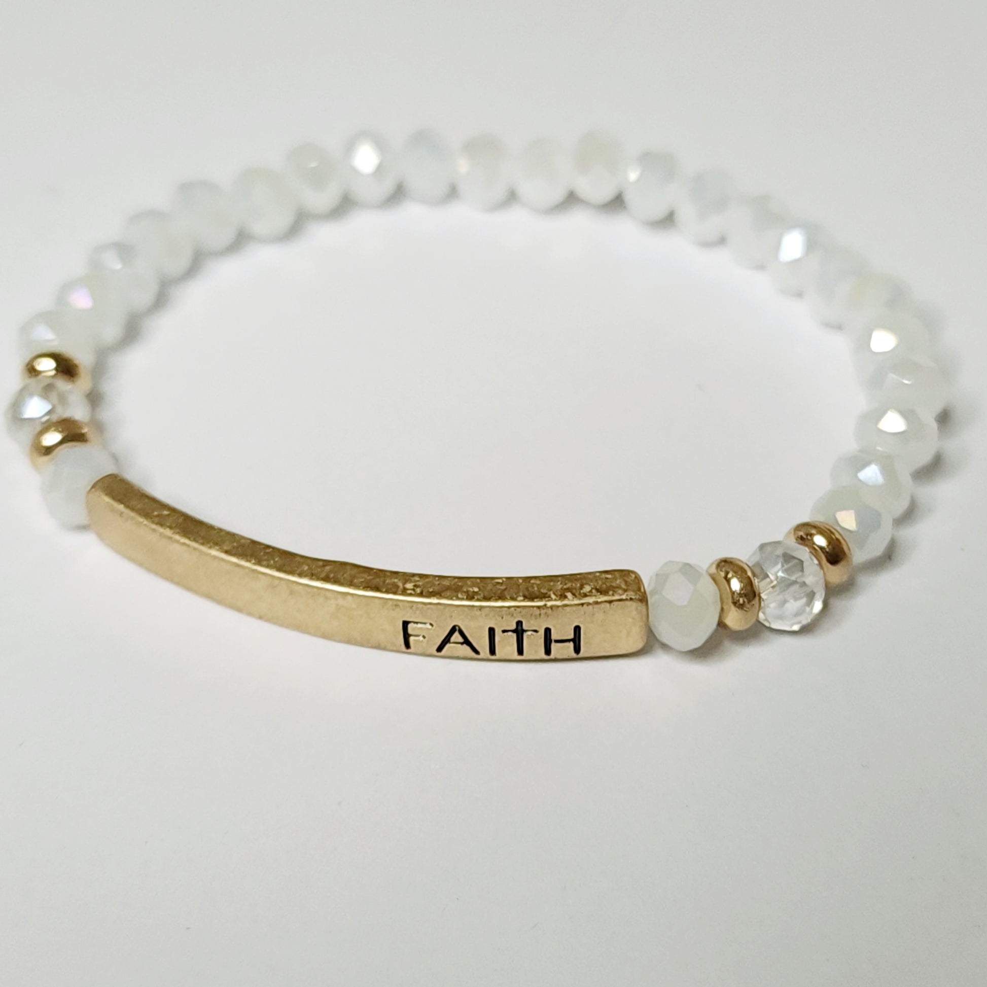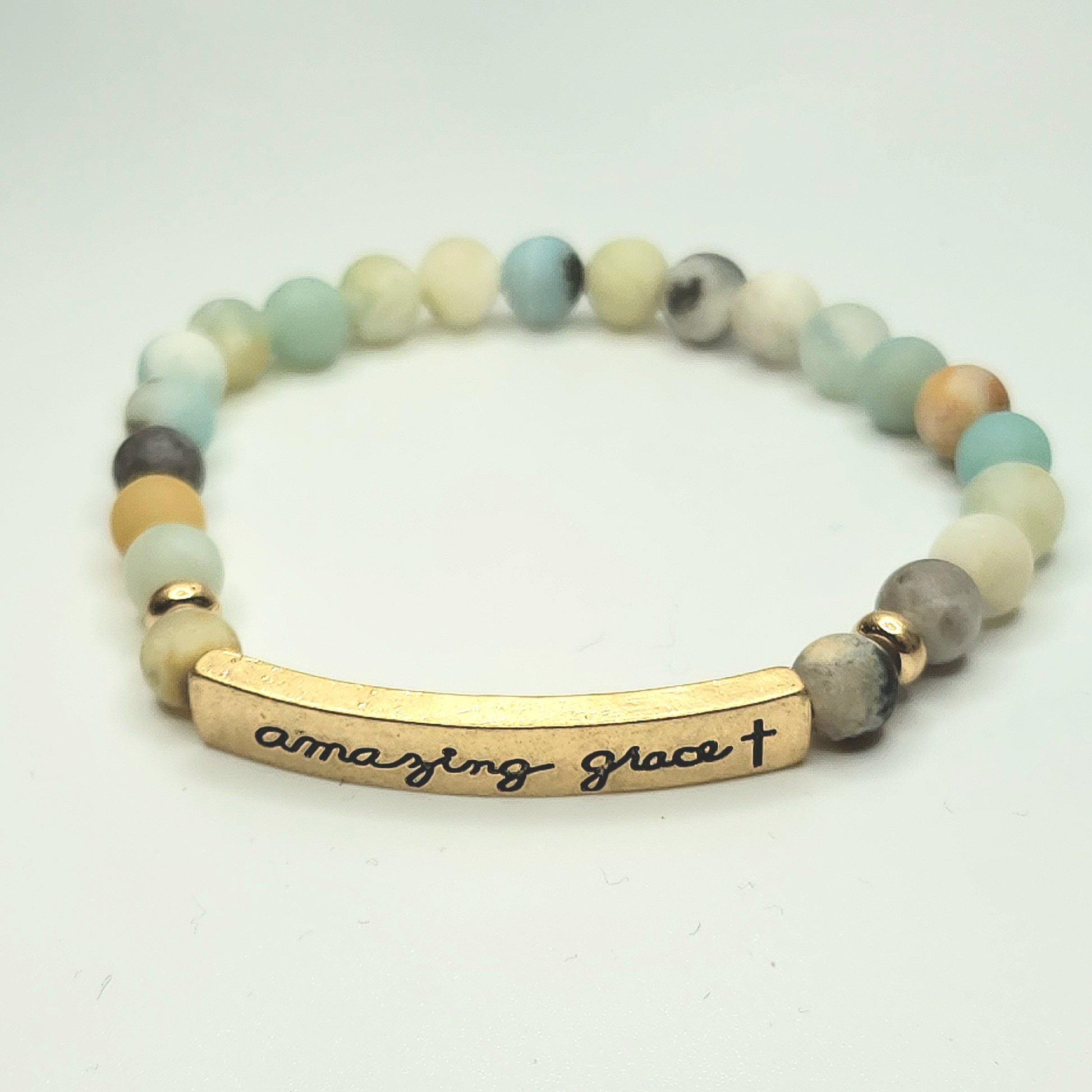 Wear your faith on your sleeve (LOL) or better yet your wrist. You will enjoy this beautiful yet simple bracelet as a symbol and reminder of your faith. This faith inspired gold tone message bar stretch bracelet surrounded by semi precious stone beads- will encourage a daily reminder of what you believe in and what was freely given to you.