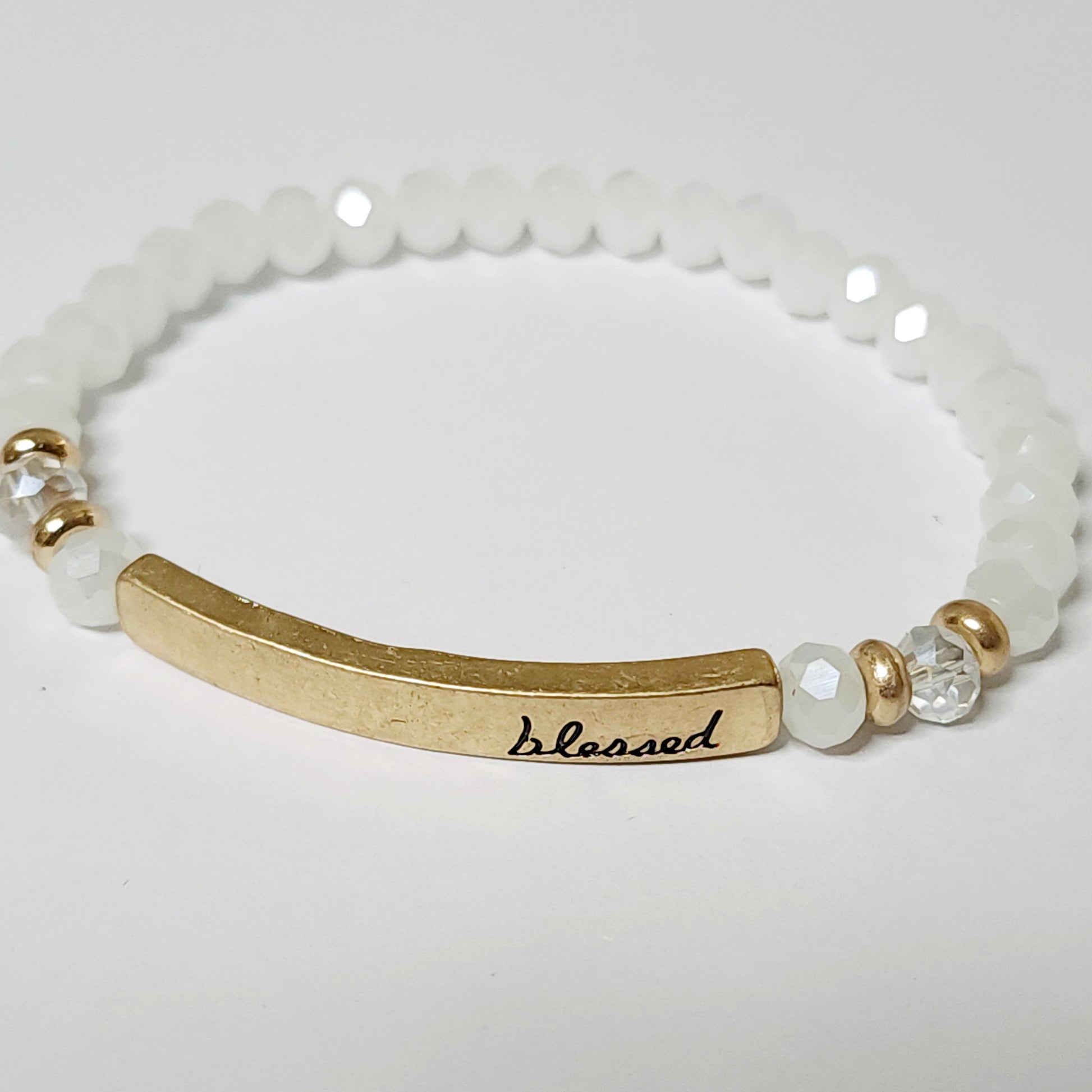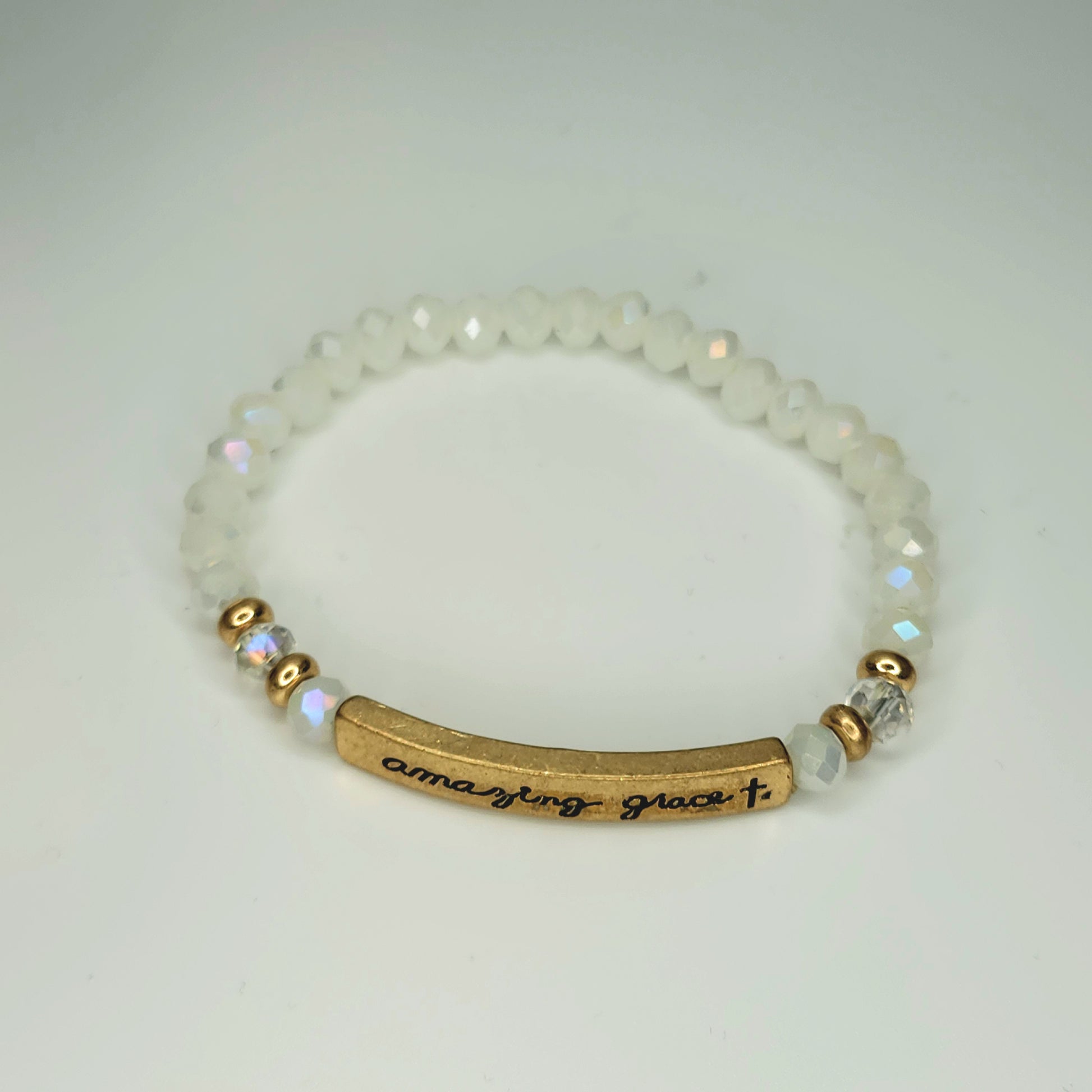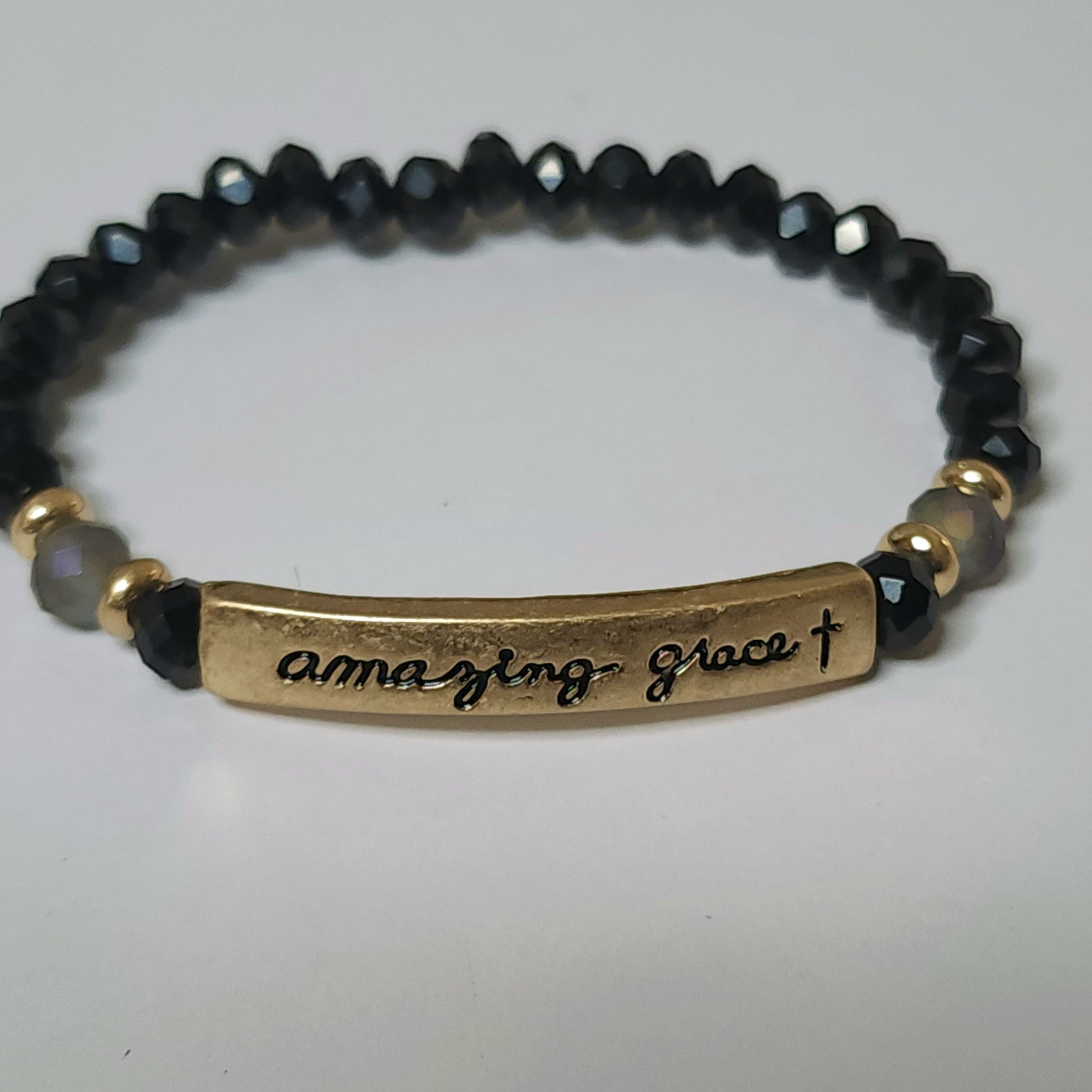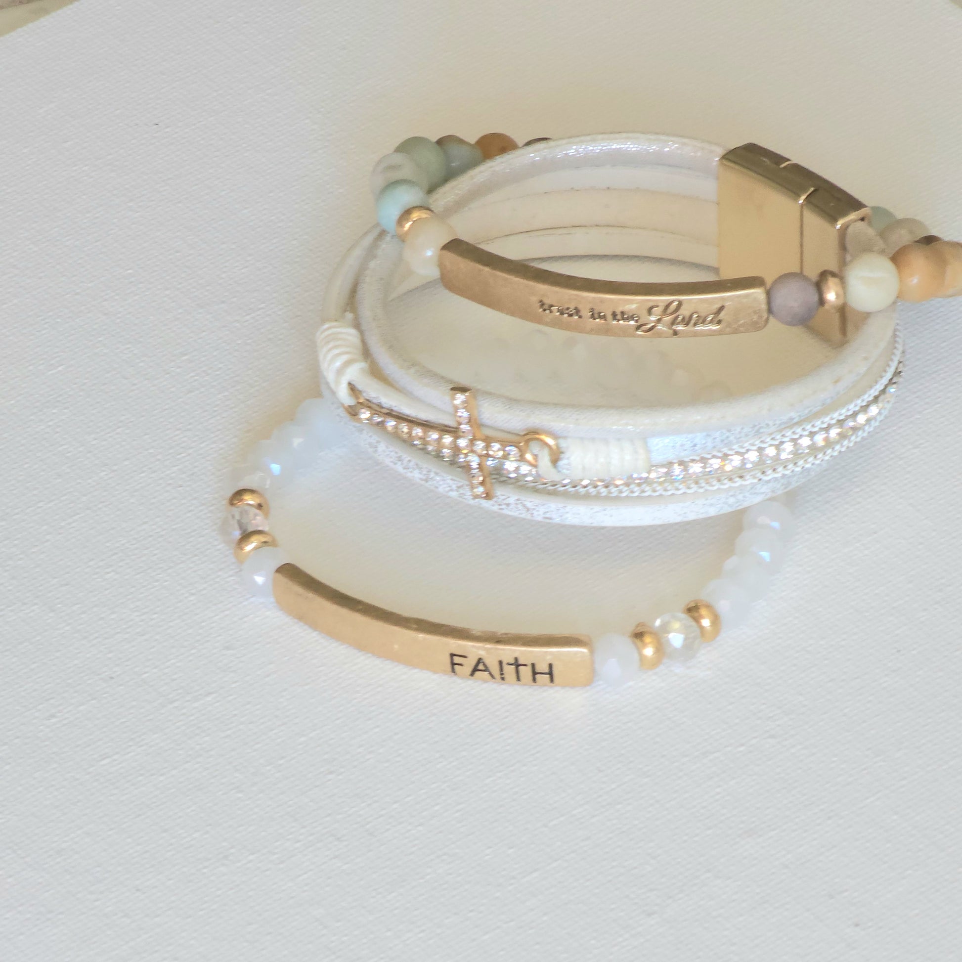 Wear your faith on your sleeve (LOL) or better yet your wrist. You will enjoy this beautiful yet simple bracelet as a symbol and reminder of your faith. This faith inspired gold tone message bar stretch bracelet surrounded by semi precious stone beads- will encourage a daily reminder of what you believe in and what was freely given to you.