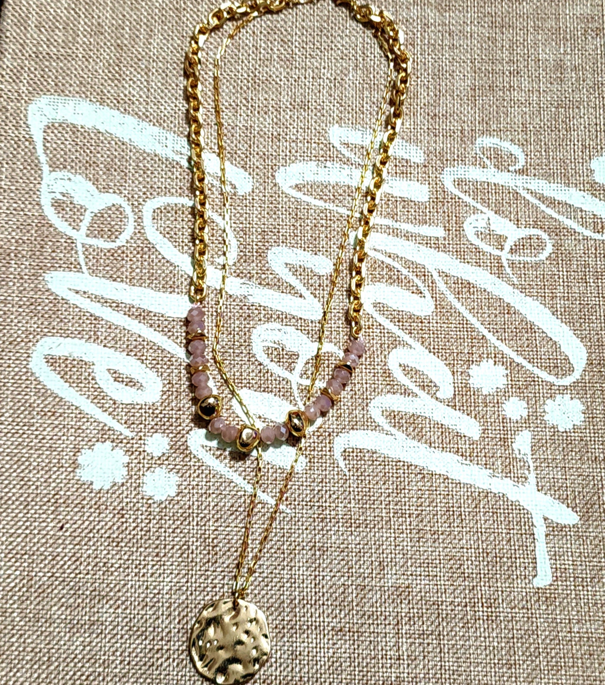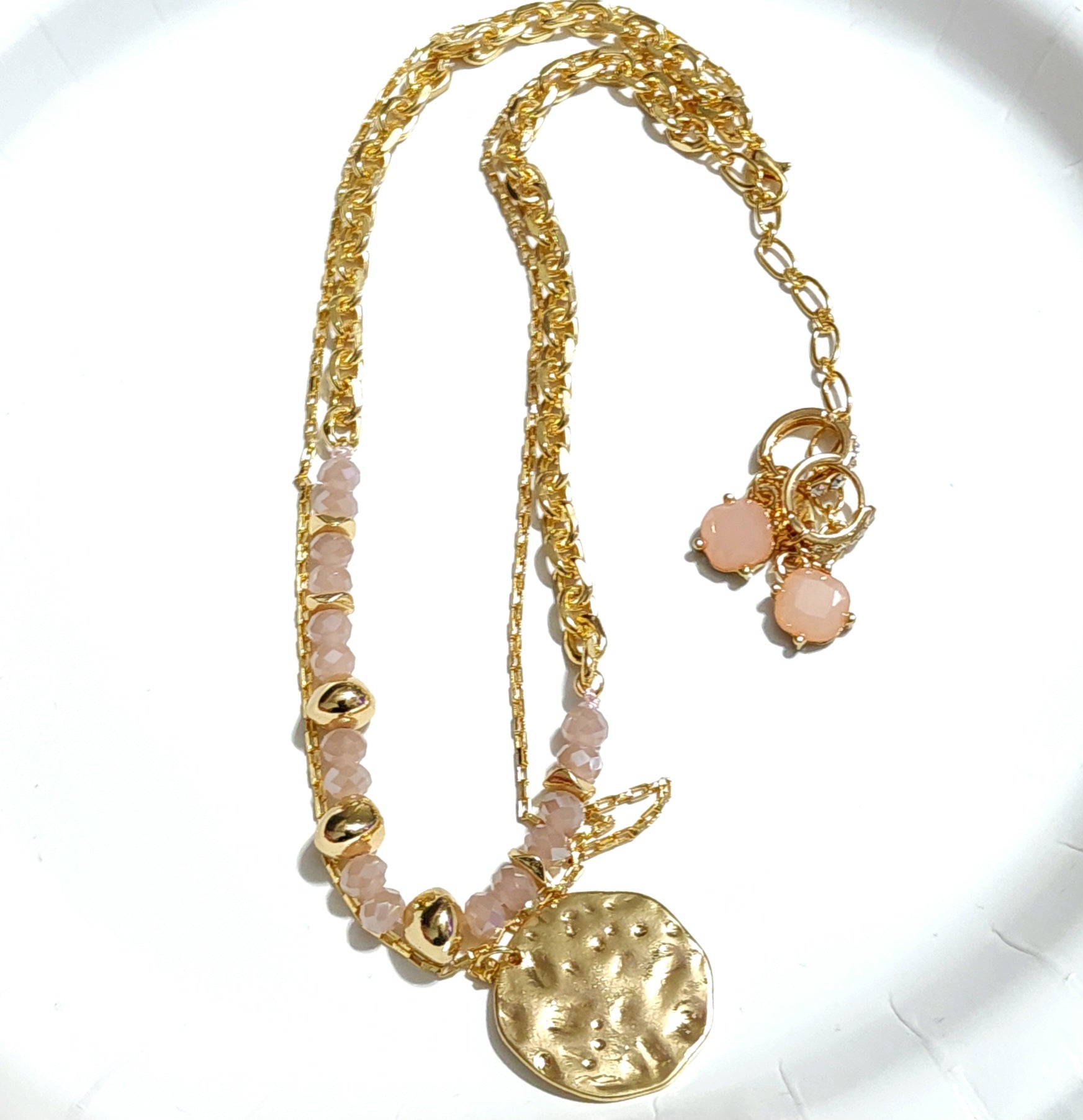 goldtone multi layered nackle pink crystal accent textured round pendant design